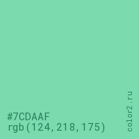 Цвет RGB(124, 218, 175) в процентом отношении количества цвета состоит из 48.6% красного (red), 85.5% зелёного (green) и 68.6% синего (blue).