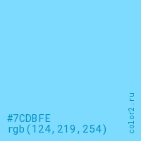 Цвет #7CDBFE в цветовой модели RGB обозначается тремя октетами (124, 219, 254) в десятичном формате и #7CDBFE в шестнадцатиричном (hex) формате, которые являются интенсивностью красного 124 (hex 7C), интенсивность зелёного 219 (hex DB) и интенсивность синего 254 (hex FE).