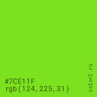 Цвет #7CE11F в цветовой модели RGB обозначается тремя октетами (124, 225, 31) в десятичном формате и #7CE11F в шестнадцатиричном (hex) формате, которые являются интенсивностью красного 124 (hex 7C), интенсивность зелёного 225 (hex E1) и интенсивность синего 31 (hex 1F).
