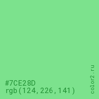 Цвет #7CE28D в цветовой модели RGB обозначается тремя октетами (124, 226, 141) в десятичном формате и #7CE28D в шестнадцатиричном (hex) формате, которые являются интенсивностью красного 124 (hex 7C), интенсивность зелёного 226 (hex E2) и интенсивность синего 141 (hex 8D).