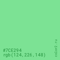 Цвет #7CE294 в цветовой модели RGB обозначается тремя октетами (124, 226, 148) в десятичном формате и #7CE294 в шестнадцатиричном (hex) формате, которые являются интенсивностью красного 124 (hex 7C), интенсивность зелёного 226 (hex E2) и интенсивность синего 148 (hex 94).
