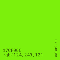 Цвет #7CF00C в цветовой модели RGB обозначается тремя октетами (124, 240, 12) в десятичном формате и #7CF00C в шестнадцатиричном (hex) формате, которые являются интенсивностью красного 124 (hex 7C), интенсивность зелёного 240 (hex F0) и интенсивность синего 12 (hex 0C).