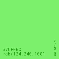 Цвет #7CF06C в цветовой модели RGB обозначается тремя октетами (124, 240, 108) в десятичном формате и #7CF06C в шестнадцатиричном (hex) формате, которые являются интенсивностью красного 124 (hex 7C), интенсивность зелёного 240 (hex F0) и интенсивность синего 108 (hex 6C).