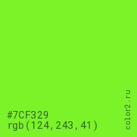 Цвет #7CF329 в цветовой модели RGB обозначается тремя октетами (124, 243, 41) в десятичном формате и #7CF329 в шестнадцатиричном (hex) формате, которые являются интенсивностью красного 124 (hex 7C), интенсивность зелёного 243 (hex F3) и интенсивность синего 41 (hex 29).