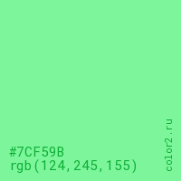 Цвет #7CF59B в цветовой модели RGB обозначается тремя октетами (124, 245, 155) в десятичном формате и #7CF59B в шестнадцатиричном (hex) формате, которые являются интенсивностью красного 124 (hex 7C), интенсивность зелёного 245 (hex F5) и интенсивность синего 155 (hex 9B).