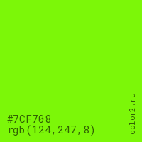 Цвет #7CF708 в цветовой модели RGB обозначается тремя октетами (124, 247, 8) в десятичном формате и #7CF708 в шестнадцатиричном (hex) формате, которые являются интенсивностью красного 124 (hex 7C), интенсивность зелёного 247 (hex F7) и интенсивность синего 8 (hex 08).