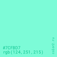 Цвет #7CFBD7 в цветовой модели RGB обозначается тремя октетами (124, 251, 215) в десятичном формате и #7CFBD7 в шестнадцатиричном (hex) формате, которые являются интенсивностью красного 124 (hex 7C), интенсивность зелёного 251 (hex FB) и интенсивность синего 215 (hex D7).