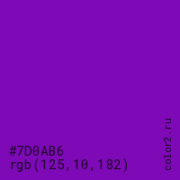 Цвет #7D0AB6 в цветовой модели RGB обозначается тремя октетами (125, 10, 182) в десятичном формате и #7D0AB6 в шестнадцатиричном (hex) формате, которые являются интенсивностью красного 125 (hex 7D), интенсивность зелёного 10 (hex 0A) и интенсивность синего 182 (hex B6).