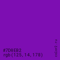 Цвет #7D0EB2 в цветовой модели RGB обозначается тремя октетами (125, 14, 178) в десятичном формате и #7D0EB2 в шестнадцатиричном (hex) формате, которые являются интенсивностью красного 125 (hex 7D), интенсивность зелёного 14 (hex 0E) и интенсивность синего 178 (hex B2).