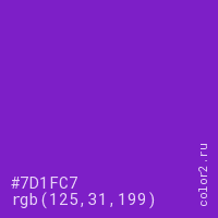 Цвет #7D1FC7 в цветовой модели RGB обозначается тремя октетами (125, 31, 199) в десятичном формате и #7D1FC7 в шестнадцатиричном (hex) формате, которые являются интенсивностью красного 125 (hex 7D), интенсивность зелёного 31 (hex 1F) и интенсивность синего 199 (hex C7).