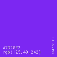Цвет #7D28F2 в цветовой модели RGB обозначается тремя октетами (125, 40, 242) в десятичном формате и #7D28F2 в шестнадцатиричном (hex) формате, которые являются интенсивностью красного 125 (hex 7D), интенсивность зелёного 40 (hex 28) и интенсивность синего 242 (hex F2).