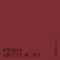 Цвет #7D2E34 в цветовой модели RGB обозначается тремя октетами (125, 46, 52) в десятичном формате и #7D2E34 в шестнадцатиричном (hex) формате, которые являются интенсивностью красного 125 (hex 7D), интенсивность зелёного 46 (hex 2E) и интенсивность синего 52 (hex 34).