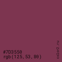 Цвет #7D3550 в цветовой модели RGB обозначается тремя октетами (125, 53, 80) в десятичном формате и #7D3550 в шестнадцатиричном (hex) формате, которые являются интенсивностью красного 125 (hex 7D), интенсивность зелёного 53 (hex 35) и интенсивность синего 80 (hex 50).