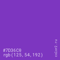 Цвет #7D36C0 в цветовой модели RGB обозначается тремя октетами (125, 54, 192) в десятичном формате и #7D36C0 в шестнадцатиричном (hex) формате, которые являются интенсивностью красного 125 (hex 7D), интенсивность зелёного 54 (hex 36) и интенсивность синего 192 (hex C0).