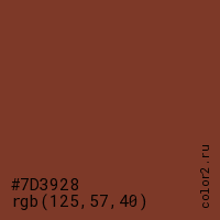 Цвет #7D3928 в цветовой модели RGB обозначается тремя октетами (125, 57, 40) в десятичном формате и #7D3928 в шестнадцатиричном (hex) формате, которые являются интенсивностью красного 125 (hex 7D), интенсивность зелёного 57 (hex 39) и интенсивность синего 40 (hex 28).