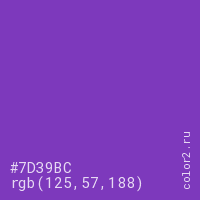 Цвет #7D39BC в цветовой модели RGB обозначается тремя октетами (125, 57, 188) в десятичном формате и #7D39BC в шестнадцатиричном (hex) формате, которые являются интенсивностью красного 125 (hex 7D), интенсивность зелёного 57 (hex 39) и интенсивность синего 188 (hex BC).