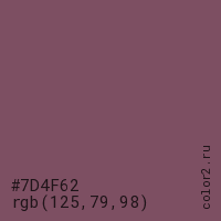Цвет #7D4F62 в цветовой модели RGB обозначается тремя октетами (125, 79, 98) в десятичном формате и #7D4F62 в шестнадцатиричном (hex) формате, которые являются интенсивностью красного 125 (hex 7D), интенсивность зелёного 79 (hex 4F) и интенсивность синего 98 (hex 62).