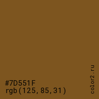 Цвет #7D551F в цветовой модели RGB обозначается тремя октетами (125, 85, 31) в десятичном формате и #7D551F в шестнадцатиричном (hex) формате, которые являются интенсивностью красного 125 (hex 7D), интенсивность зелёного 85 (hex 55) и интенсивность синего 31 (hex 1F).