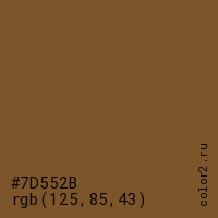 Цвет #7D552B в цветовой модели RGB обозначается тремя октетами (125, 85, 43) в десятичном формате и #7D552B в шестнадцатиричном (hex) формате, которые являются интенсивностью красного 125 (hex 7D), интенсивность зелёного 85 (hex 55) и интенсивность синего 43 (hex 2B).
