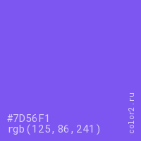 Цвет #7D56F1 в цветовой модели RGB обозначается тремя октетами (125, 86, 241) в десятичном формате и #7D56F1 в шестнадцатиричном (hex) формате, которые являются интенсивностью красного 125 (hex 7D), интенсивность зелёного 86 (hex 56) и интенсивность синего 241 (hex F1).