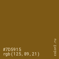 Цвет #7D5915 в цветовой модели RGB обозначается тремя октетами (125, 89, 21) в десятичном формате и #7D5915 в шестнадцатиричном (hex) формате, которые являются интенсивностью красного 125 (hex 7D), интенсивность зелёного 89 (hex 59) и интенсивность синего 21 (hex 15).