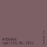 Цвет #7D6066 в цветовой модели RGB обозначается тремя октетами (125, 96, 102) в десятичном формате и #7D6066 в шестнадцатиричном (hex) формате, которые являются интенсивностью красного 125 (hex 7D), интенсивность зелёного 96 (hex 60) и интенсивность синего 102 (hex 66).