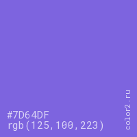 Цвет #7D64DF в цветовой модели RGB обозначается тремя октетами (125, 100, 223) в десятичном формате и #7D64DF в шестнадцатиричном (hex) формате, которые являются интенсивностью красного 125 (hex 7D), интенсивность зелёного 100 (hex 64) и интенсивность синего 223 (hex DF).