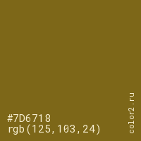 Цвет #7D6718 в цветовой модели RGB обозначается тремя октетами (125, 103, 24) в десятичном формате и #7D6718 в шестнадцатиричном (hex) формате, которые являются интенсивностью красного 125 (hex 7D), интенсивность зелёного 103 (hex 67) и интенсивность синего 24 (hex 18).