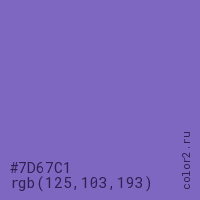 Цвет #7D67C1 в цветовой модели RGB обозначается тремя октетами (125, 103, 193) в десятичном формате и #7D67C1 в шестнадцатиричном (hex) формате, которые являются интенсивностью красного 125 (hex 7D), интенсивность зелёного 103 (hex 67) и интенсивность синего 193 (hex C1).
