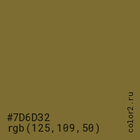 Цвет #7D6D32 в цветовой модели RGB обозначается тремя октетами (125, 109, 50) в десятичном формате и #7D6D32 в шестнадцатиричном (hex) формате, которые являются интенсивностью красного 125 (hex 7D), интенсивность зелёного 109 (hex 6D) и интенсивность синего 50 (hex 32).