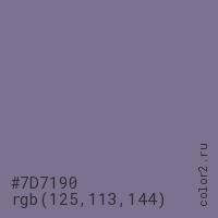 Цвет #7D7190 в цветовой модели RGB обозначается тремя октетами (125, 113, 144) в десятичном формате и #7D7190 в шестнадцатиричном (hex) формате, которые являются интенсивностью красного 125 (hex 7D), интенсивность зелёного 113 (hex 71) и интенсивность синего 144 (hex 90).
