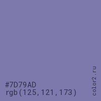 Цвет #7D79AD в цветовой модели RGB обозначается тремя октетами (125, 121, 173) в десятичном формате и #7D79AD в шестнадцатиричном (hex) формате, которые являются интенсивностью красного 125 (hex 7D), интенсивность зелёного 121 (hex 79) и интенсивность синего 173 (hex AD).