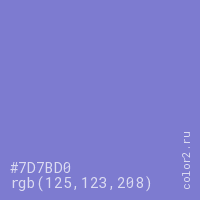 Цвет #7D7BD0 в цветовой модели RGB обозначается тремя октетами (125, 123, 208) в десятичном формате и #7D7BD0 в шестнадцатиричном (hex) формате, которые являются интенсивностью красного 125 (hex 7D), интенсивность зелёного 123 (hex 7B) и интенсивность синего 208 (hex D0).