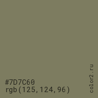 Цвет #7D7C60 в цветовой модели RGB обозначается тремя октетами (125, 124, 96) в десятичном формате и #7D7C60 в шестнадцатиричном (hex) формате, которые являются интенсивностью красного 125 (hex 7D), интенсивность зелёного 124 (hex 7C) и интенсивность синего 96 (hex 60).
