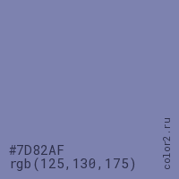 Цвет #7D82AF в цветовой модели RGB обозначается тремя октетами (125, 130, 175) в десятичном формате и #7D82AF в шестнадцатиричном (hex) формате, которые являются интенсивностью красного 125 (hex 7D), интенсивность зелёного 130 (hex 82) и интенсивность синего 175 (hex AF).