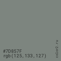 Цвет #7D857F в цветовой модели RGB обозначается тремя октетами (125, 133, 127) в десятичном формате и #7D857F в шестнадцатиричном (hex) формате, которые являются интенсивностью красного 125 (hex 7D), интенсивность зелёного 133 (hex 85) и интенсивность синего 127 (hex 7F).