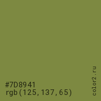Цвет #7D8941 в цветовой модели RGB обозначается тремя октетами (125, 137, 65) в десятичном формате и #7D8941 в шестнадцатиричном (hex) формате, которые являются интенсивностью красного 125 (hex 7D), интенсивность зелёного 137 (hex 89) и интенсивность синего 65 (hex 41).