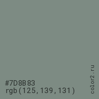 Цвет #7D8B83 в цветовой модели RGB обозначается тремя октетами (125, 139, 131) в десятичном формате и #7D8B83 в шестнадцатиричном (hex) формате, которые являются интенсивностью красного 125 (hex 7D), интенсивность зелёного 139 (hex 8B) и интенсивность синего 131 (hex 83).