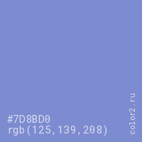 Цвет #7D8BD0 в цветовой модели RGB обозначается тремя октетами (125, 139, 208) в десятичном формате и #7D8BD0 в шестнадцатиричном (hex) формате, которые являются интенсивностью красного 125 (hex 7D), интенсивность зелёного 139 (hex 8B) и интенсивность синего 208 (hex D0).