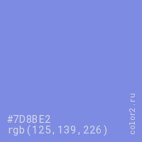 Цвет #7D8BE2 в цветовой модели RGB обозначается тремя октетами (125, 139, 226) в десятичном формате и #7D8BE2 в шестнадцатиричном (hex) формате, которые являются интенсивностью красного 125 (hex 7D), интенсивность зелёного 139 (hex 8B) и интенсивность синего 226 (hex E2).