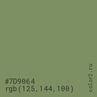 Цвет #7D9064 в цветовой модели RGB обозначается тремя октетами (125, 144, 100) в десятичном формате и #7D9064 в шестнадцатиричном (hex) формате, которые являются интенсивностью красного 125 (hex 7D), интенсивность зелёного 144 (hex 90) и интенсивность синего 100 (hex 64).