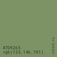 Цвет #7D9265 в цветовой модели RGB обозначается тремя октетами (125, 146, 101) в десятичном формате и #7D9265 в шестнадцатиричном (hex) формате, которые являются интенсивностью красного 125 (hex 7D), интенсивность зелёного 146 (hex 92) и интенсивность синего 101 (hex 65).