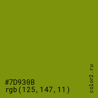 Цвет #7D930B в цветовой модели RGB обозначается тремя октетами (125, 147, 11) в десятичном формате и #7D930B в шестнадцатиричном (hex) формате, которые являются интенсивностью красного 125 (hex 7D), интенсивность зелёного 147 (hex 93) и интенсивность синего 11 (hex 0B).