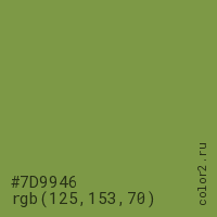 Цвет #7D9946 в цветовой модели RGB обозначается тремя октетами (125, 153, 70) в десятичном формате и #7D9946 в шестнадцатиричном (hex) формате, которые являются интенсивностью красного 125 (hex 7D), интенсивность зелёного 153 (hex 99) и интенсивность синего 70 (hex 46).