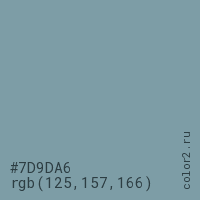 Цвет #7D9DA6 в цветовой модели RGB обозначается тремя октетами (125, 157, 166) в десятичном формате и #7D9DA6 в шестнадцатиричном (hex) формате, которые являются интенсивностью красного 125 (hex 7D), интенсивность зелёного 157 (hex 9D) и интенсивность синего 166 (hex A6).