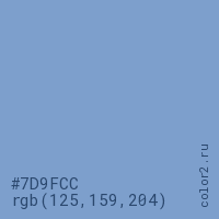 Цвет #7D9FCC в цветовой модели RGB обозначается тремя октетами (125, 159, 204) в десятичном формате и #7D9FCC в шестнадцатиричном (hex) формате, которые являются интенсивностью красного 125 (hex 7D), интенсивность зелёного 159 (hex 9F) и интенсивность синего 204 (hex CC).