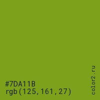 Цвет #7DA11B в цветовой модели RGB обозначается тремя октетами (125, 161, 27) в десятичном формате и #7DA11B в шестнадцатиричном (hex) формате, которые являются интенсивностью красного 125 (hex 7D), интенсивность зелёного 161 (hex A1) и интенсивность синего 27 (hex 1B).