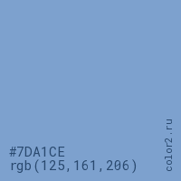 Цвет #7DA1CE в цветовой модели RGB обозначается тремя октетами (125, 161, 206) в десятичном формате и #7DA1CE в шестнадцатиричном (hex) формате, которые являются интенсивностью красного 125 (hex 7D), интенсивность зелёного 161 (hex A1) и интенсивность синего 206 (hex CE).