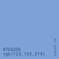 Цвет #7DA3D6 в цветовой модели RGB обозначается тремя октетами (125, 163, 214) в десятичном формате и #7DA3D6 в шестнадцатиричном (hex) формате, которые являются интенсивностью красного 125 (hex 7D), интенсивность зелёного 163 (hex A3) и интенсивность синего 214 (hex D6).