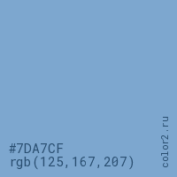 Цвет #7DA7CF в цветовой модели RGB обозначается тремя октетами (125, 167, 207) в десятичном формате и #7DA7CF в шестнадцатиричном (hex) формате, которые являются интенсивностью красного 125 (hex 7D), интенсивность зелёного 167 (hex A7) и интенсивность синего 207 (hex CF).